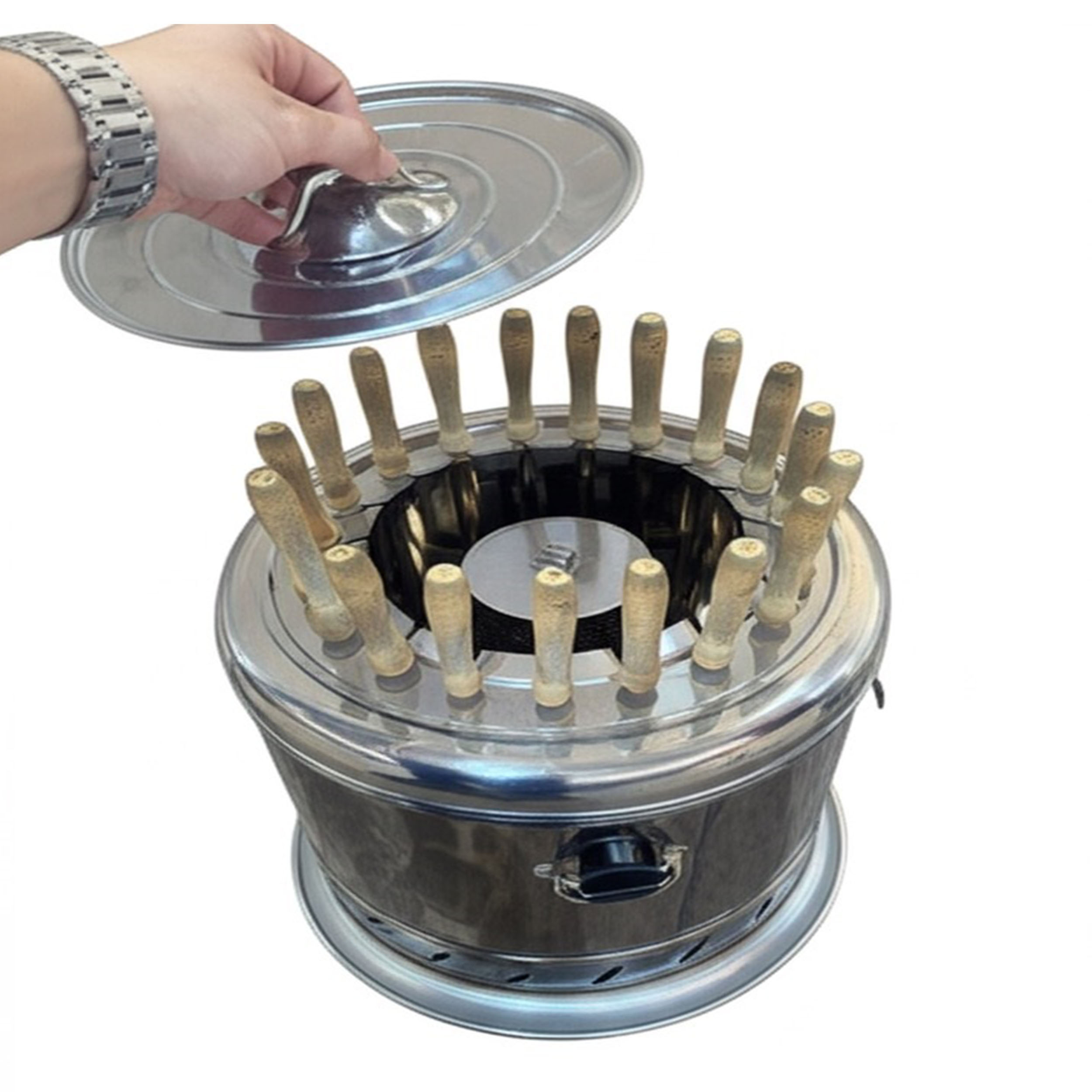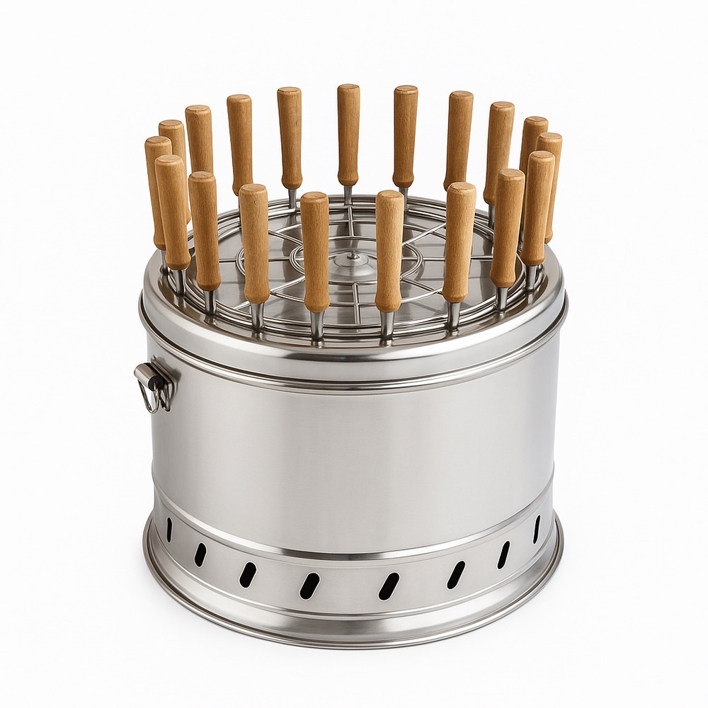 منقل زغالی بدون دود یک انتخاب حرفهای و جذاب برای لذت بردن از طعم اصیل کباب در خانه یا سفر است. این منقل با طراحی استوانهای و بدنهای از ورق استیل ضد زنگ ساخته شده که هم دوام بالا دارد و هم ظاهری مدرن و زیبا به محیط میبخشد. سیستم منحصربهفرد این منقل شامل یک محفظهی جداگانه برای ذغال است که امکان کنترل دقیق حرارت را فراهم میکند. چیدمان ۱۸ سیخ در داخل منقل و وجود شعلهپخشکن حرفهای باعث میشود حرارت به صورت یکنواخت توزیع شود و پخت یکدست و خوشطعم مواد غذایی تضمین گردد.